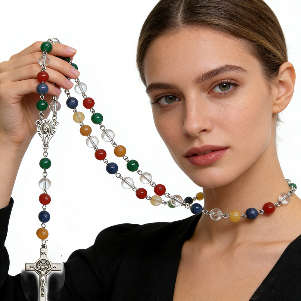 彩色天然石圣本笃十字架念珠项链