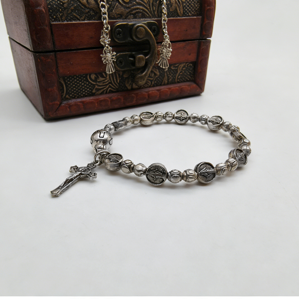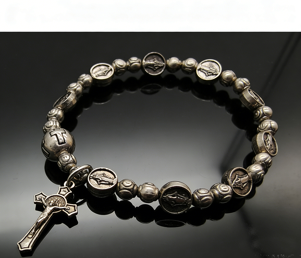 复古弹力绳十字珠十字架手链 男士金属做旧手链