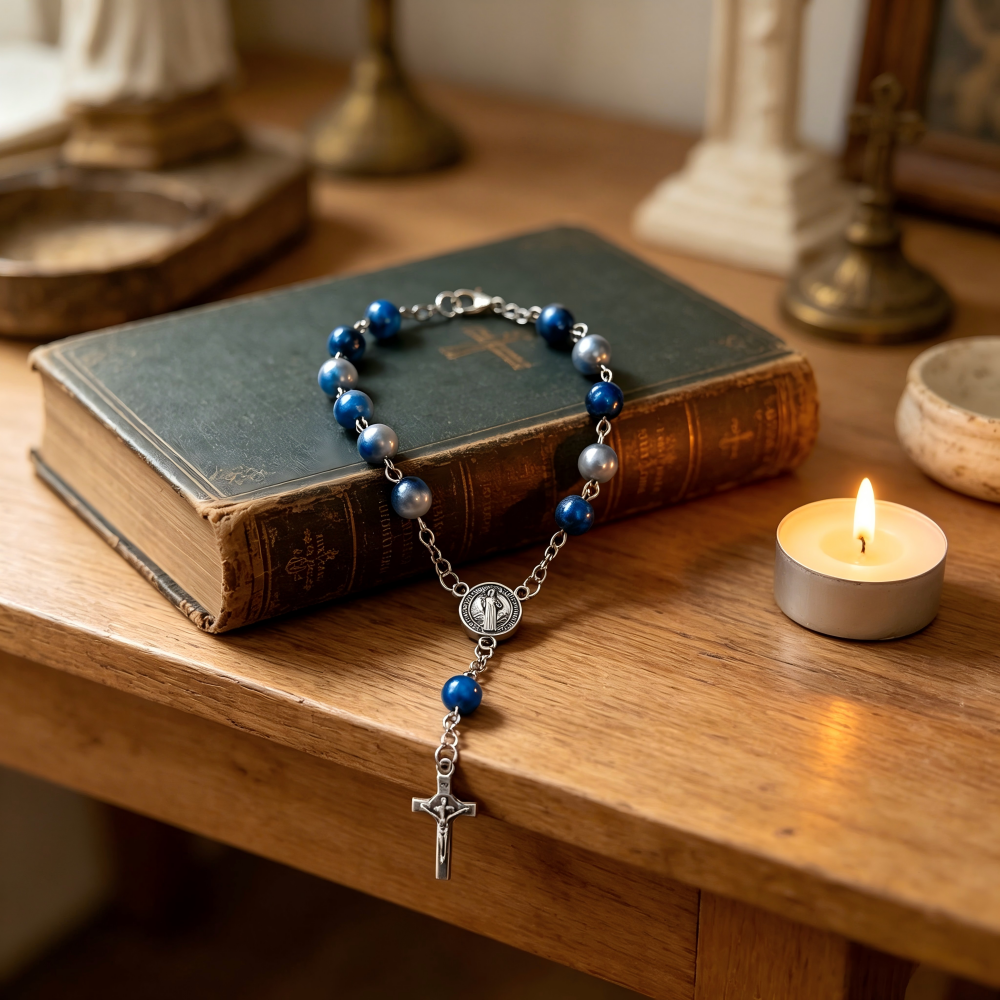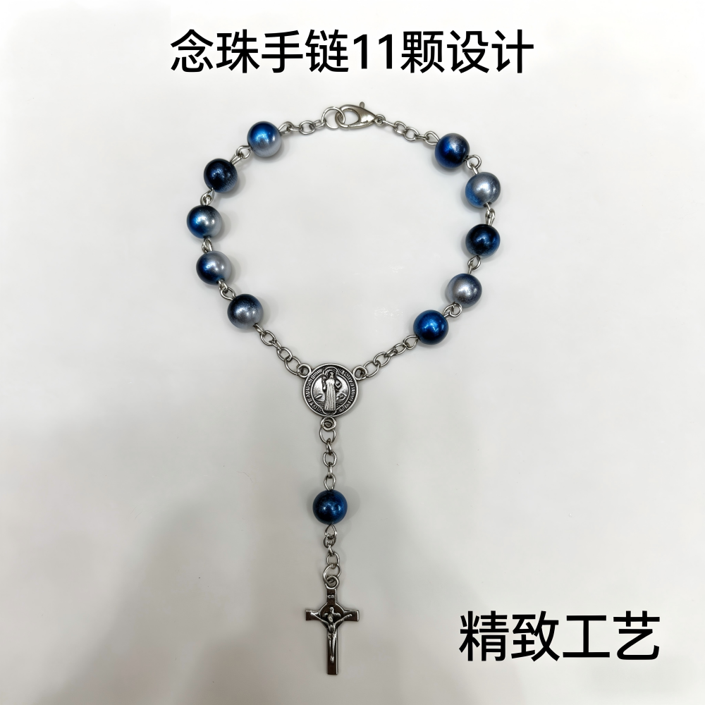 (蓝色)磨砂珠玫瑰经念珠手链 镀金镶钻爱心十字架饰品 洗礼礼物
