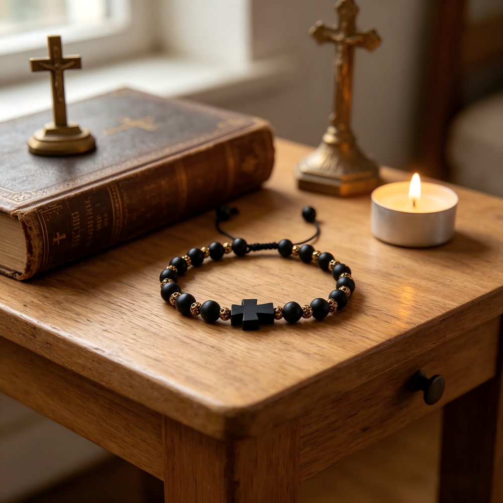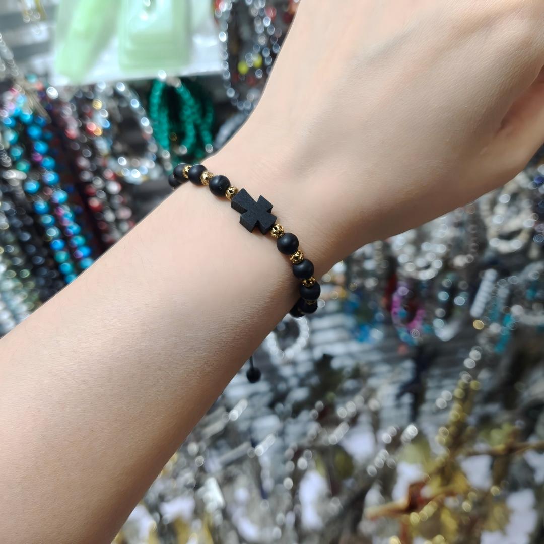 经典款黑色磨砂珠配金色铜珠十字架绳抽手链