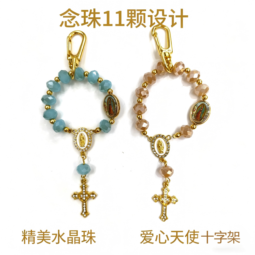 (香槟金)切面水晶瓜达卢佩圣母念珠钥匙扣饰品批发