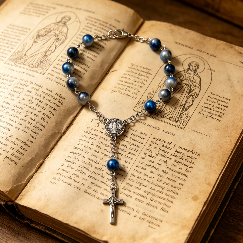 古银)One Decade十字架圣本奖章口袋念珠棕色木珠手串