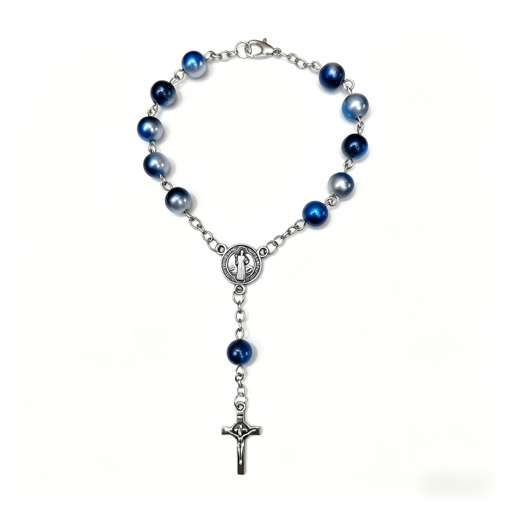 (蓝色)磨砂珠玫瑰经念珠手链 镀金镶钻爱心十字架饰品 洗礼礼物