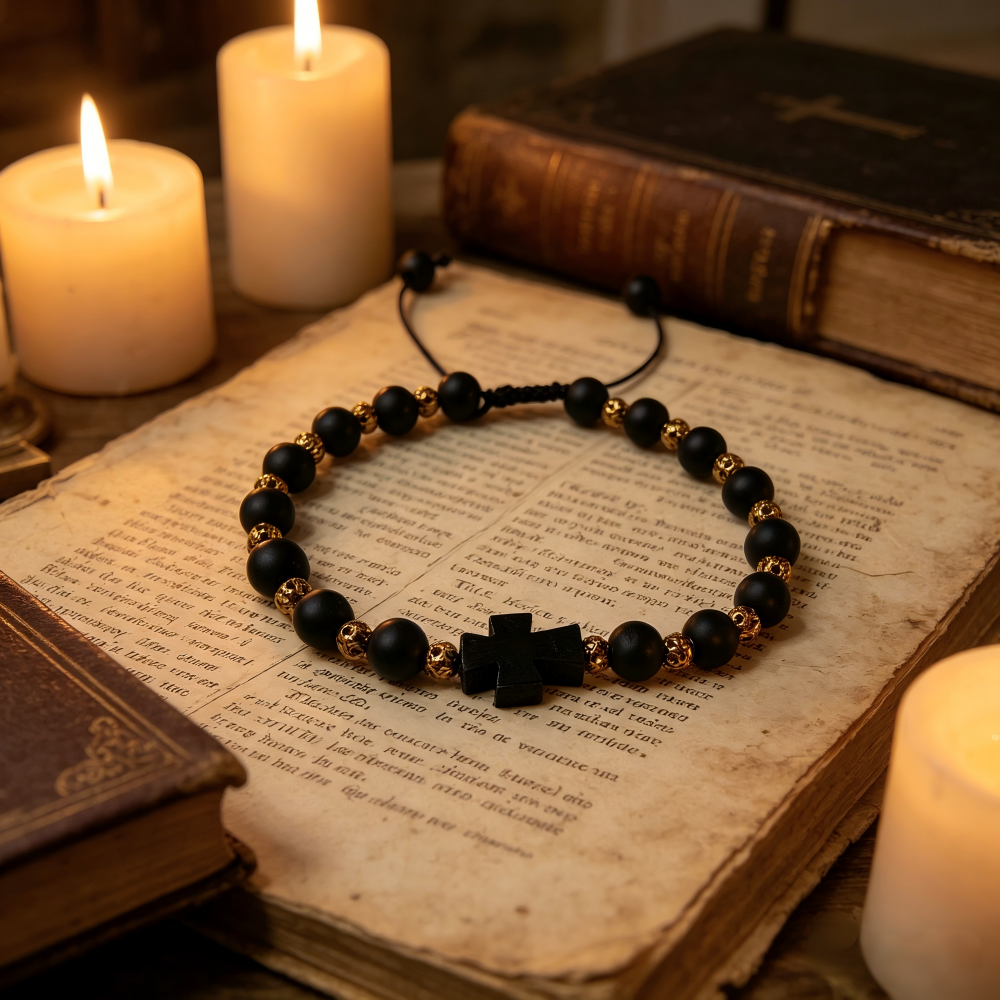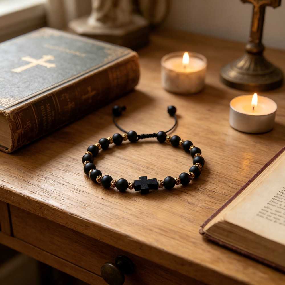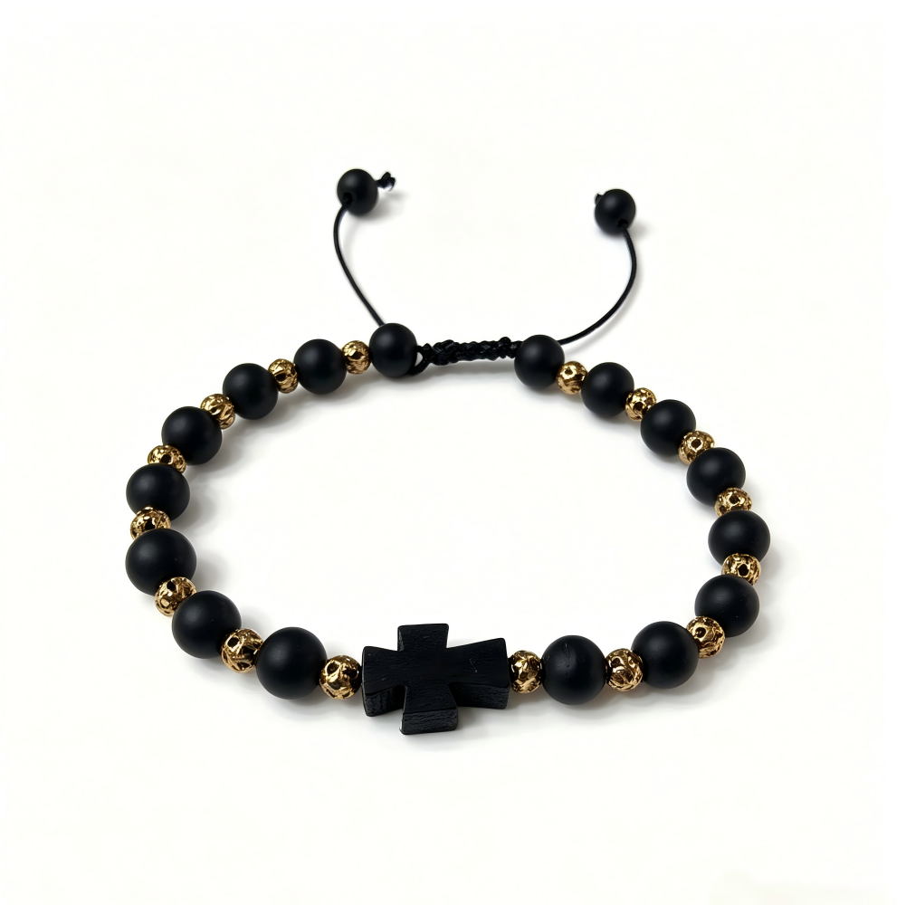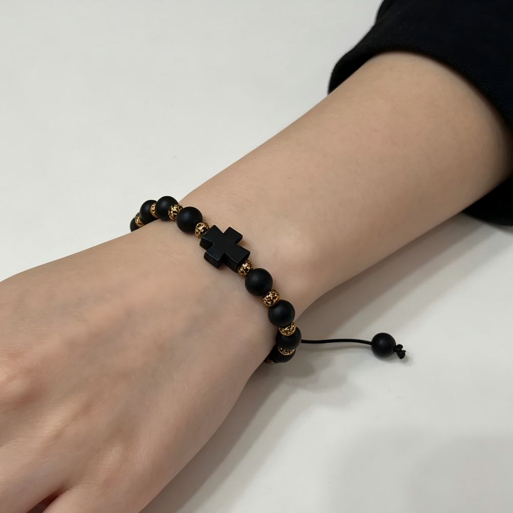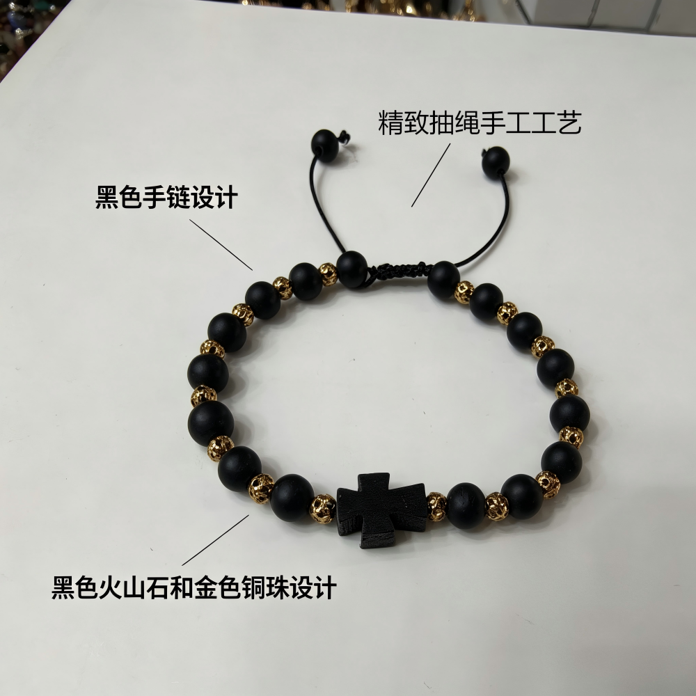 经典款黑色磨砂珠配金色铜珠十字架绳抽手链